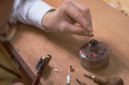 Mit dem Einschieben des Schubes und dem Aufsetzen des Froschringes ist der erste Arbeitsschritt des Beziehens beendet. Nun wird jedoch zunächst das Kopfkästchen ausgestochen. Die Form entspricht im Wesentlichen der des Froschkästchens. Nachdem das Kästchen mit feinen Meißeln ausgestochen ist, wird die Oberfläche der Kopfplatte geschliffen und poliert. |